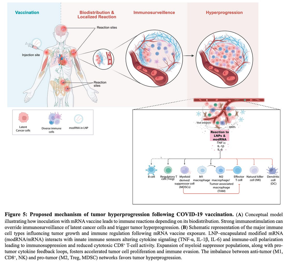 Figure 5 illustrates how lipid nanoparticle–encapsulated mRNA can trigger strong localized and systemic immune activation, including cytokine release (TNF-α, IL-1β, IL-6). This immune shift reduces cytotoxic CD8⁺ T-cell and NK-cell activity while expanding immunosuppressive populations (Tregs, MDSCs, M2 macrophages), creating conditions that allow latent or controlled tumors to escape immune surveillance and rapidly progress.