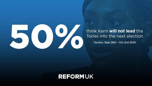 At 5 pm, a brutal poll for Kemi Badenoch dropped from Sky News. It showed that 50% of Tory members want Kemi Badenoch to resign as leader. It showed that even her own party members don’t rate her! What a disastrous start to her conference.